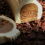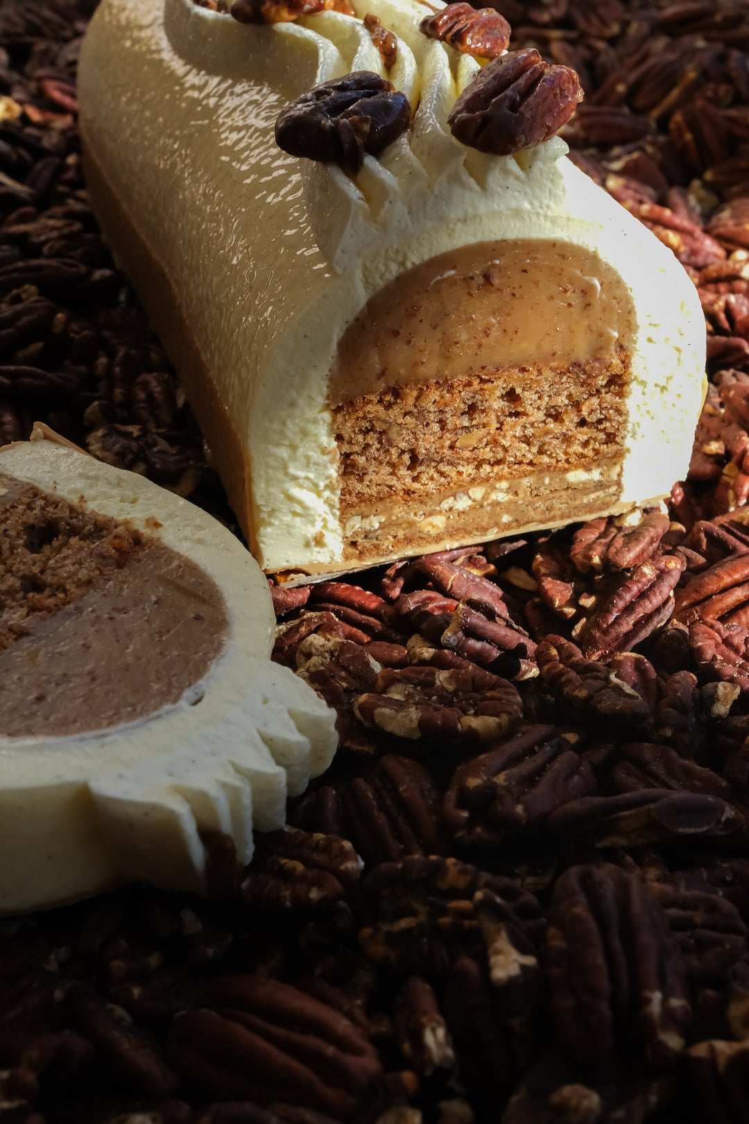 Le grand retour de notre fameux gâteau vanille et pacanes en habits de fêtes ! Vous pourrez retrouver un croustillant, un crémeux et un biscuit pacane ainsi qu'une mousse vanille. Un grand succès de notre carte passée !