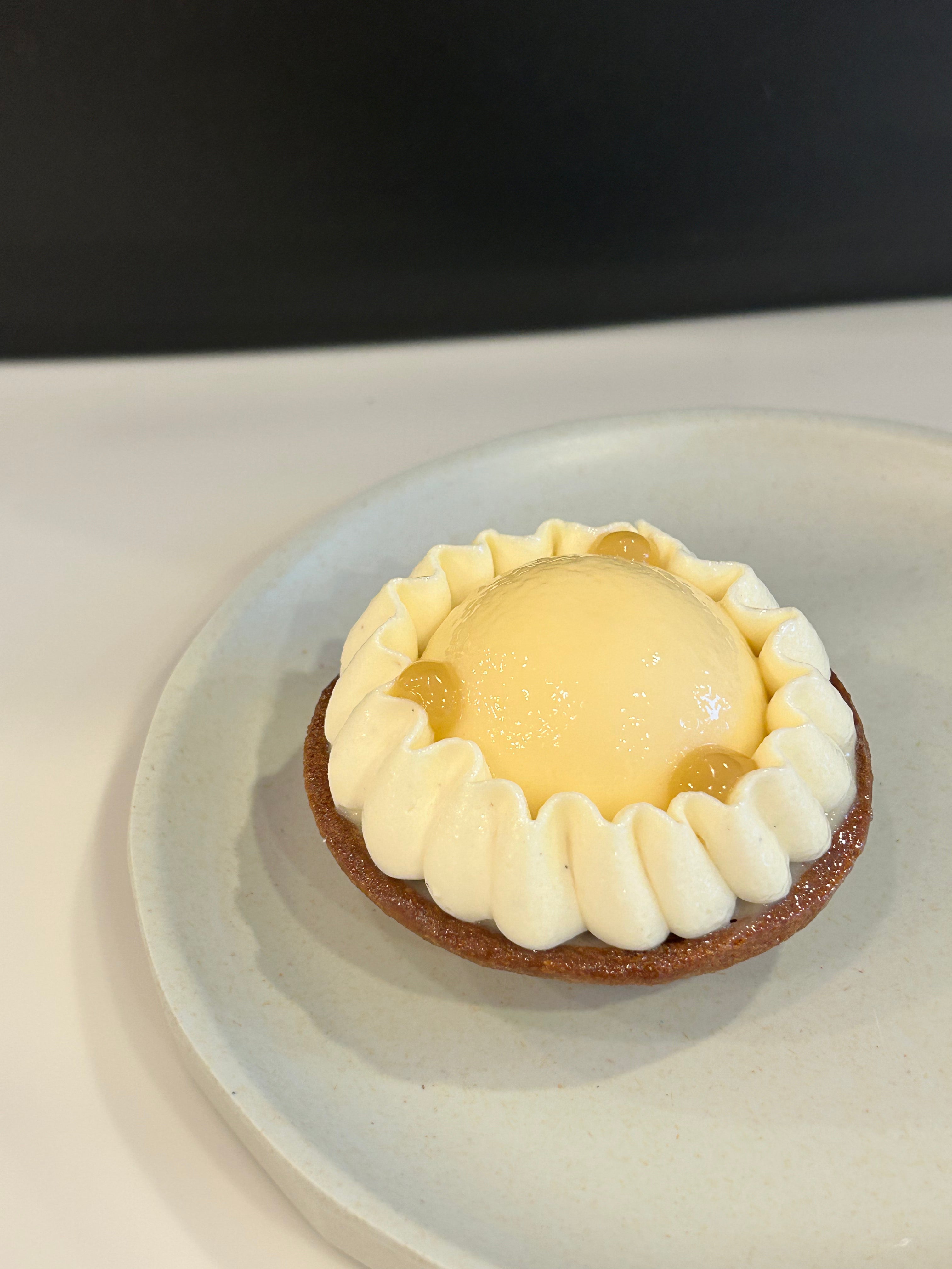 Avec l'arrivée de l'hiver, nous vous proposons une tarte aux saveurs ensoleillées. Vous pourrez retrouver sur une pâte sucrée, une crème d'amande, un crémeux citron et pamplemousse, un gel lime ainsi qu'une ganache montée aux baies de Timut. Originaires du Népal, les baies (ou poivre) de Timut révèlent des arômes fruités rappelant le pamplemousse rose, la citronnelle ou les fruits de la passion.